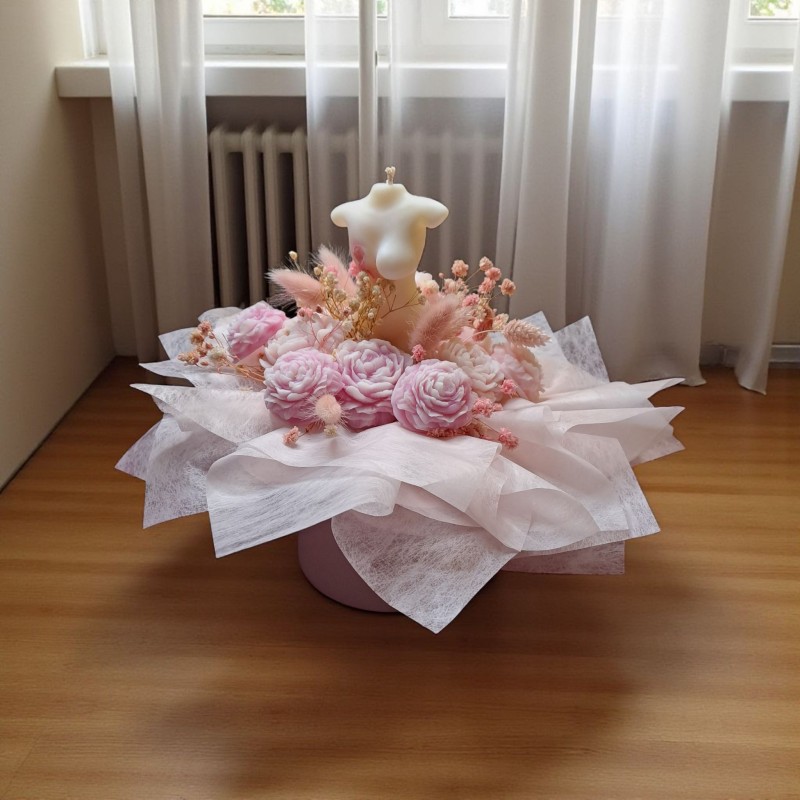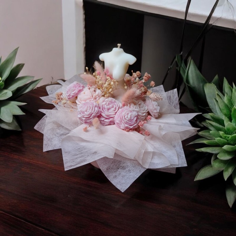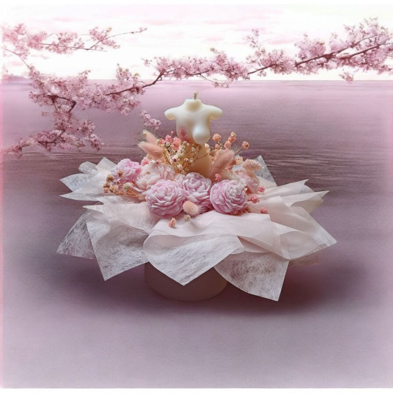 Composé d'une bougie Buste avec ruban rose, 11 fondants parfumés en forme de Pivoine